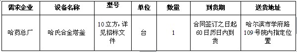 一、采购名称:哈药集团制药总厂115车间哈氏合金塔釜招标