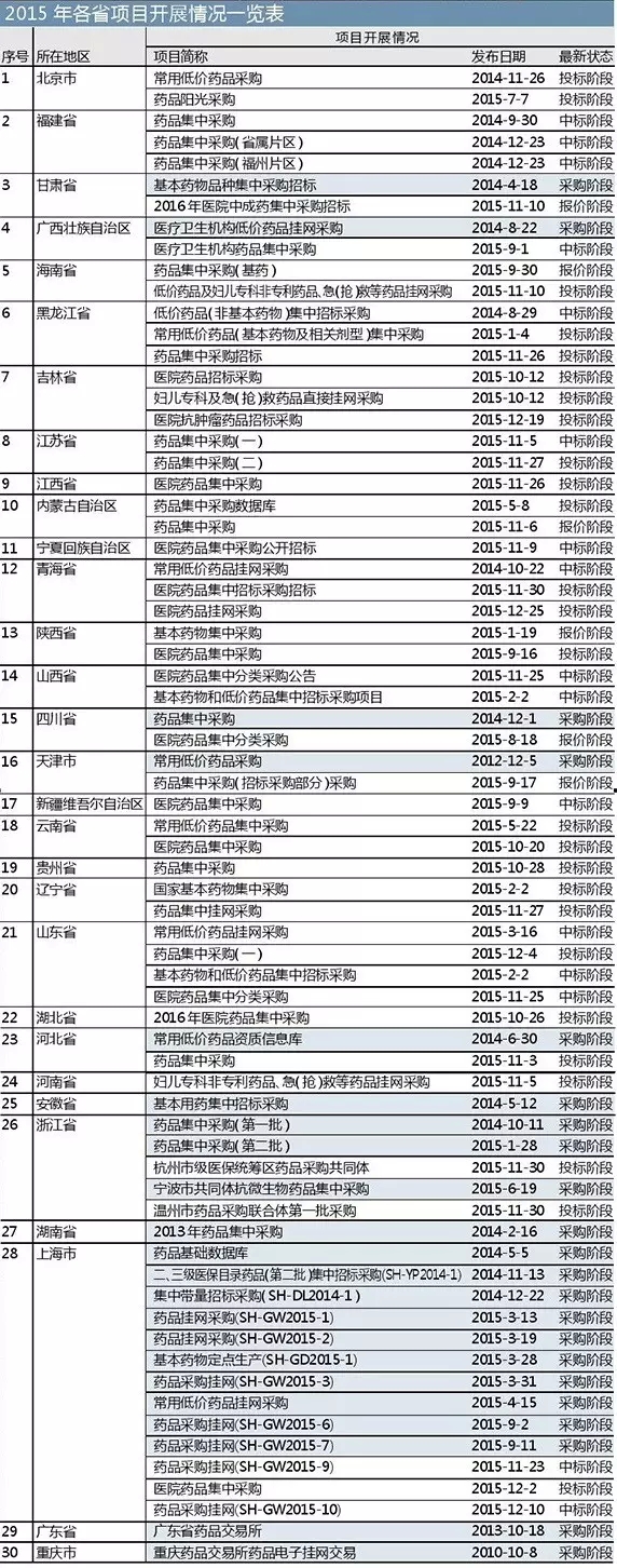可见,各省方案已基本落地,但目前各省较多的是先进行妇儿专科非专利药品、急(抢)救药品的采购,其次是双信封招标采购,更多的预计于2016年才能以直接挂网等形式陆续完成招标采购。