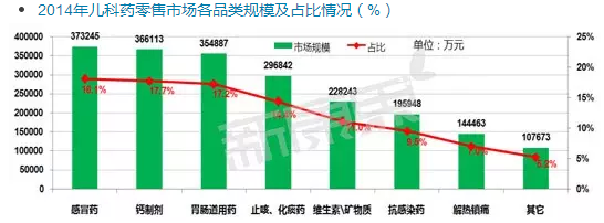 目前儿童药市场规模,还没有统一的数据,主要是由于对儿童药的定义以及药品分类归属的有所不同。根据中康CMH的统计,目前零售市场儿童药主要集中在感冒药、钙制剂、胃肠道用药、止咳化痰药,维生素/矿物质、抗感染用药、解热镇痛以及其他用药,儿童药零售市场整体规模在207亿元左右。
