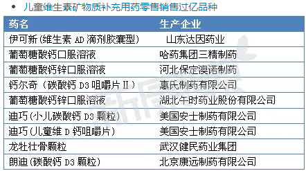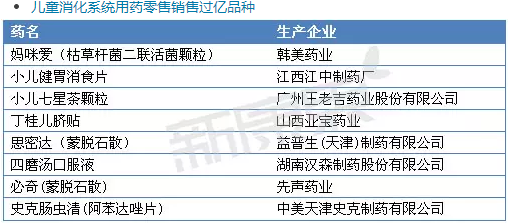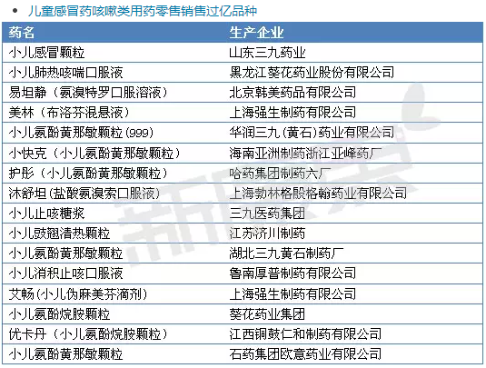 如果从市场销售重磅品种来看,2014年底销售过亿的品种主要集中在儿童感冒咳嗽类用药、儿童消化系统用药和儿童维生素矿物质补充用药。以下是医药零售市场销售过亿的品牌。