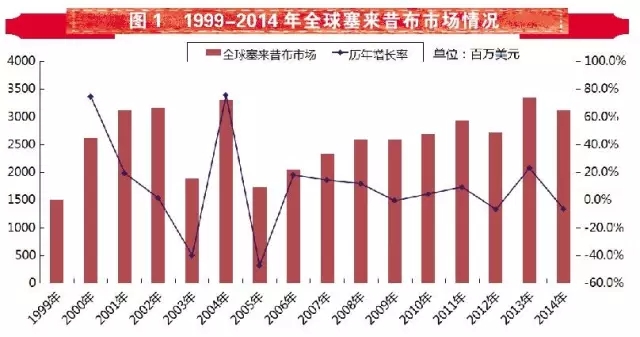 辉瑞的塞来昔布是特异性COX-2抑制剂,1999年获得FDA批准上市,用于治疗风湿性关节炎和骨关节炎引起的疼痛,对胃肠道的损害较小,逐渐成为非甾体抗炎药的主流产品。2004年,因受罗非昔布(万络)等心血管安全性问题的影响,辉瑞塞来昔布(西乐葆)销售额由2004年的33.02亿美元下降至2005年的17.3亿美元,2011年逐步恢复到29.2亿美元,2014年则高达31.1亿美元。近几年销售额逐步回升,并稳定在30亿美元左右。从2005-2012年销售趋势来看,塞来昔布保持平稳增长态势。