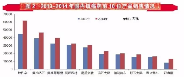 2014年排名前10位产品销售额已达30.0亿元,占整个镇痛药市场69.5%,较同期增长17.8%。可见,镇痛药物市场格局相对集中。2014年排名前10位产品销售情况为:地佐辛6.2亿元,增长37.8%;氟比洛芬4.7亿元,增长18.7%;氨基葡萄糖4.0亿元,增长22.8%;阿司匹林3.3亿元,增长4.7%;鹿瓜多肽3.1亿元,增长11.8%;瑞芬太尼2.3亿元,增长19.9%;帕瑞昔布2.0亿元,增长6.3%;舒芬太尼1.9亿元,增长19.6%;塞来昔布1.6亿元,增长5.0%;羟考酮1.3亿元,增长57.0%。