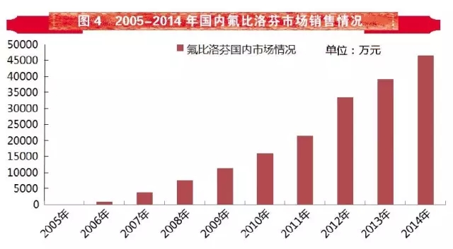 据国内22个城市样本医院数据,2014年氟比洛芬用药金额达4.7亿元,比上一年增长18.7%。从2005-2014年销售趋势来看,国内氟比洛芬连续九年保持高速增长,销售表现出色。2008年该产品销售额已超过塞来昔布,连续七年在非甾体抗炎药市场保持第一位。