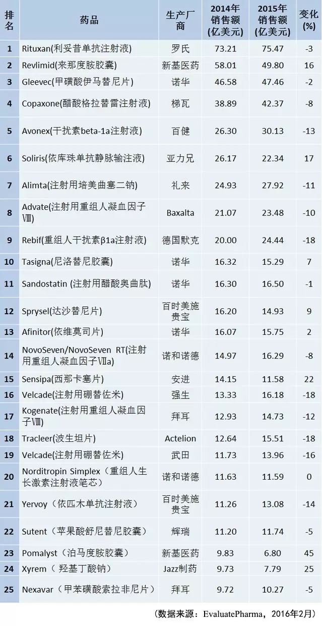 下表所列为2015年全球销售额前25位罕见病药信息。