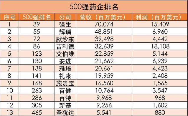 总共有13家药企入选500强榜单。强生以700.74亿美元营收排名药企第一,总榜单第39位。药企中仅次于强生的是辉瑞,营收488.51亿美元,利润69.6亿美元。其他上榜的药企包括默沙东、吉利德、艾伯维、安进、雅培、礼来、施贵宝、百健、百特、新基、圣犹达。