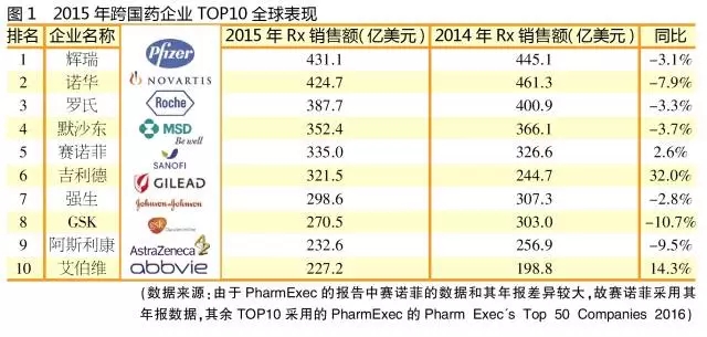 与2014年相比,2015年TOP 10企业保持不变,辉瑞、诺华、罗氏、默沙东、赛诺菲、吉利德、强生、GSK、阿斯利康和艾伯维依然位居前十,不过位次有所变化。辉瑞因为跌幅小反超了诺华。