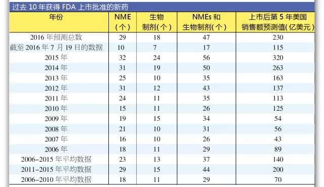 如果这些新药都能在今年获批,其在上市后的第5年,仅在美国市场的总销售额就可达到230亿美元,虽然这比2015年获批新药的预期总销售额低很多,但相比前几年,这仍是一个很好的形势(见下表)。事实上,去年的好形势并非特别现象,因为去年是新药巅峰的一年,而从今年起,新药市场将会开始走下坡。