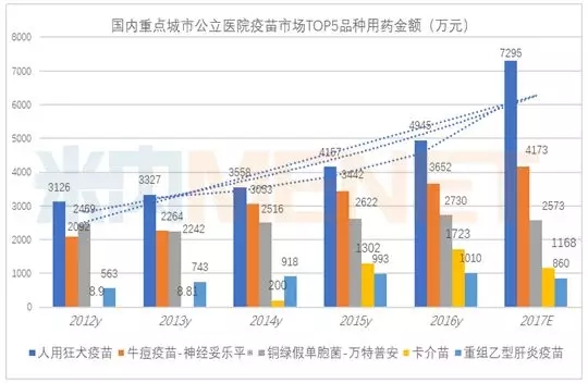 据米内网数据显示,2016年国内重点城市公立医院疫苗用药金额为1.51亿元,同比上一年增长了8.43%,按2017年1~3季度数据测算,2017年国内重点城市公立医院疫苗用药金额将达到1.73亿元,同比上一年增长率15.02%。其中用药金额TOP5疫苗品种分别是人用狂犬疫苗、牛痘疫苗、铜绿假单胞菌、卡介苗和重组乙型肝炎疫苗,这5个品种占据了疫苗市场92%的比重。