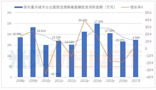 流感病毒威胁着人类健康,是导致多种继发性疾病的源头,成为了免疫力低下者的连环杀手,2017年重点城市公立医院流感病毒疫苗市场同比上一年增长4.58%,多年来流感病毒疫苗表现出起伏跌宕的走势。