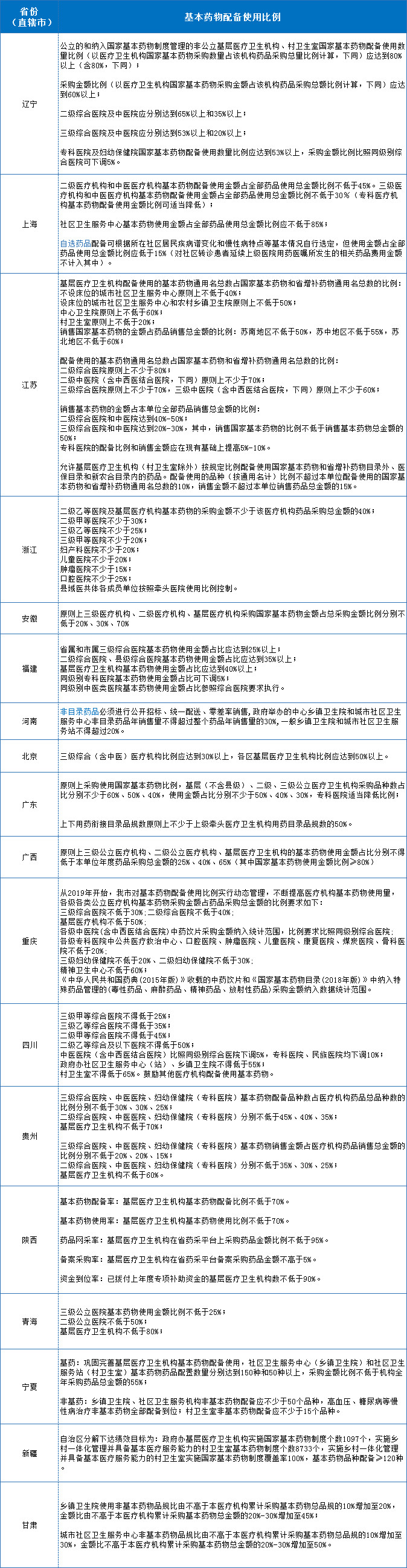 在18地划分的基药配备比例来看,三级医院占比在30%左右,二级医疗机构在40%-50%,专科医院基本药物使用金额占比有下调趋势,基层医疗机构占比普遍在60%以上。其中,在非基药目录的使用上,河南规定非目录药品必须进行公开招标、统一配送、零差率销售,政府举办的中心乡镇卫生院和城市社区卫生服务中心非目录药品年销售量不得超过整个药品年销售量的30%,一般乡镇卫生院和城市社区卫生服务站不得超过20%;宁夏要求乡镇卫生院、社区卫生服务机构非基本药物配备应不少于50个品种,高血压、糖尿病等慢性病治疗非基本药物全部配备到位;村卫生室非基本药物配备应不少于15个品种。