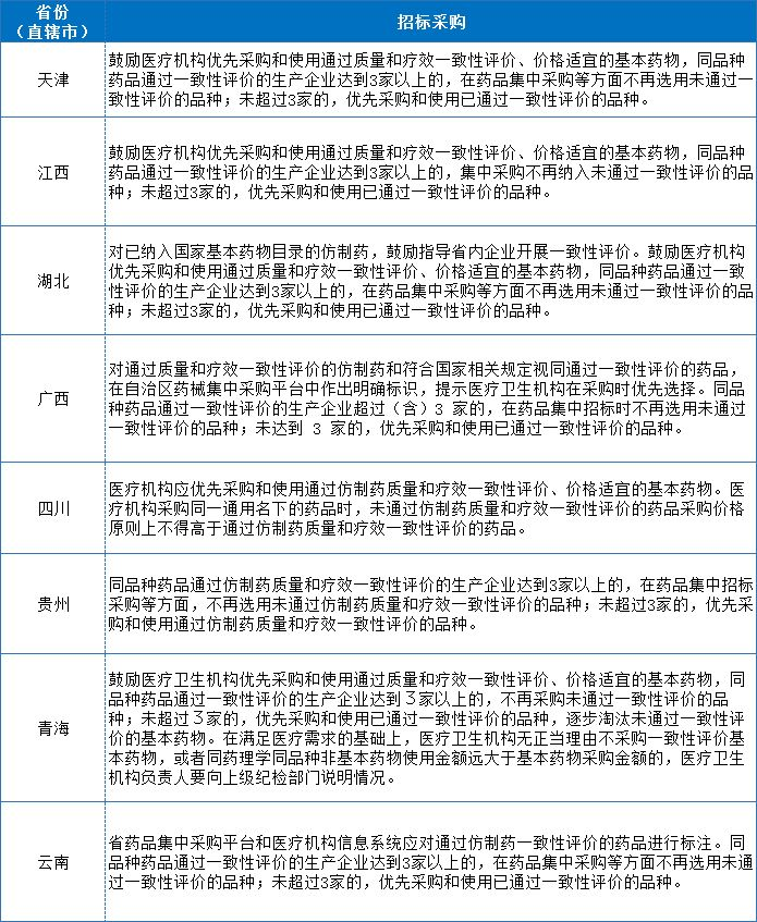 以下省份表示在基药满3家时,不采购未过评产品。同时,已在新版基药目录里的药品需进行一致性评价。实际上,未过评药品在采购中遭遇“歧视”已经成为业内的共识。据统计,已有北京、上海、广东等19个省份开始执行“已有三家过一致性评价品种的未过厂家暂停交易资格”规定。并且,江苏、黑龙江、湖北、广西等多个省份公布暂停采购药品名单,涉及企业上百家。