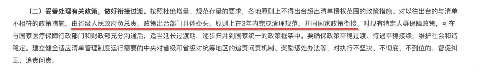 此外,文件规定“与以往出台的与清单不相符的政策措施,原则上在3年内完成清理规范”,地方医保目录的取消,有三年过渡期,不再进入的同时,可以“缓出”。
