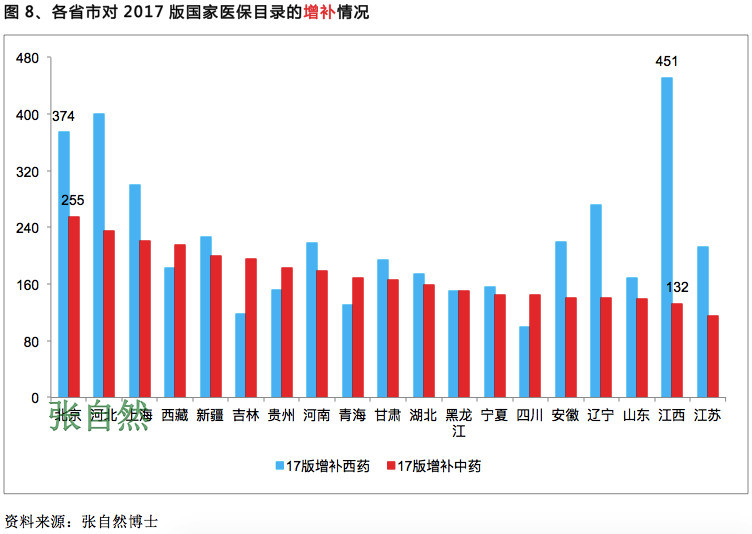 从中西药整体数量来看,河北省增补品种最多,达到635个。其中,江西省增补西药的品种数量最多,有451个品种;北京市是增补中药品种数量最多的省份,共有255个品种。从数据上看,部分地区的医保增补数量已经超过国家规定的范围(15%)。