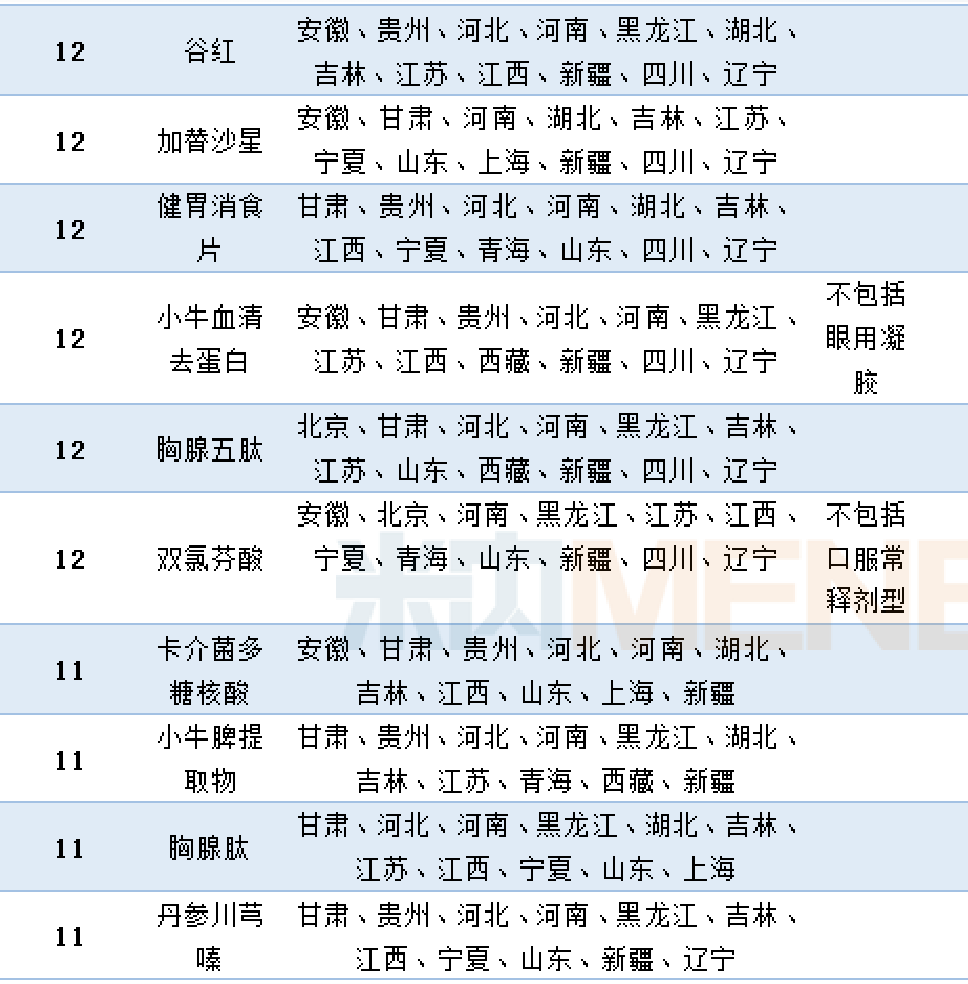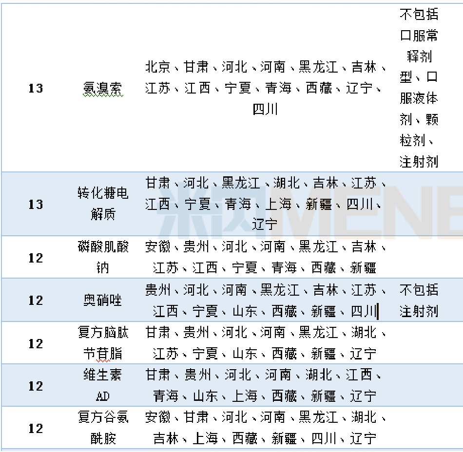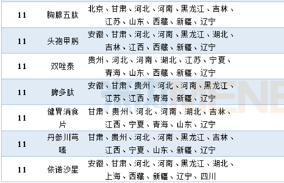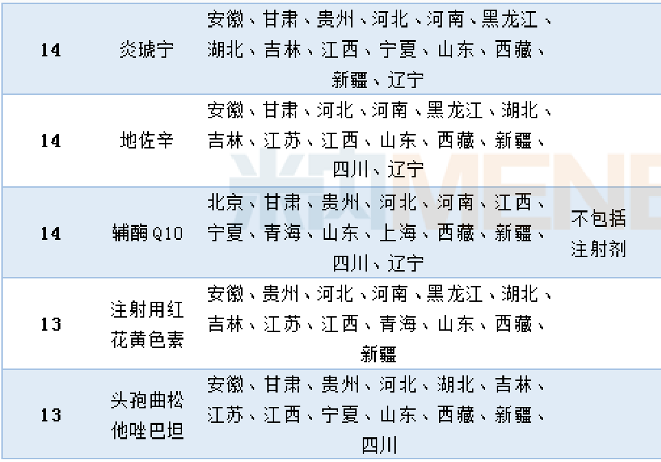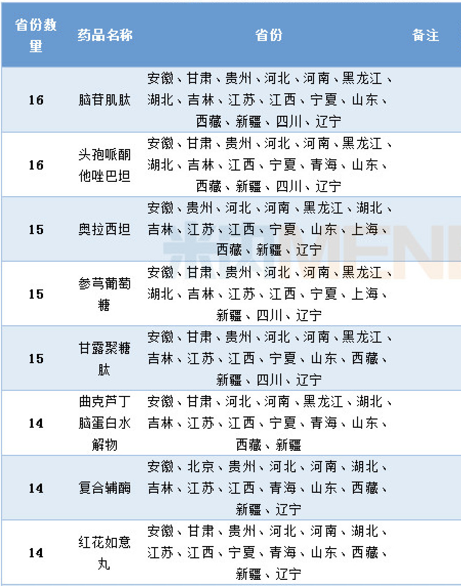 米内网数据显示,共有46个品种进入11个及以上省药品目录的增补目录中。其中,脑苷肌肽、头孢哌酮他唑巴坦、奥拉西坦、参芎葡萄糖及甘露聚糖肽进入的省增补目录达到15个以上。